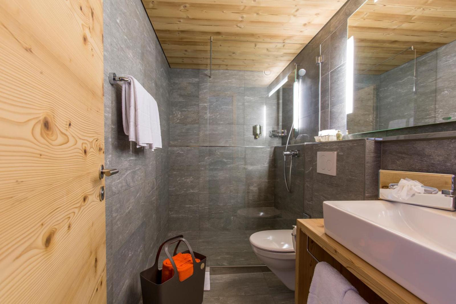 The gallery highlights the indoor pool area, where soft lighting reflects across calm water. Sauna and steam areas appear in natural tones, reinforcing the alpine setting. Relaxation rooms are designed with understated décor, encouraging stillness.